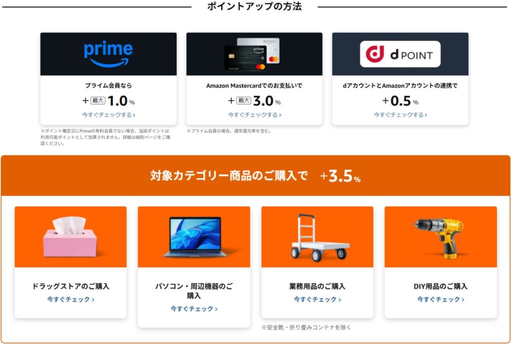 最大8%還元の内訳:プライム会員+1.5%、Amazon Mastercard最大+3%、DIY用品など対象カテゴリ+3.5%。エントリー前の購入分は対象外になるので注意。