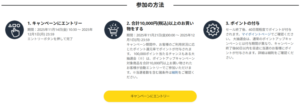 プライム会員への登録が完了したら、次にポイントアップキャンペーンにエントリーしましょう。