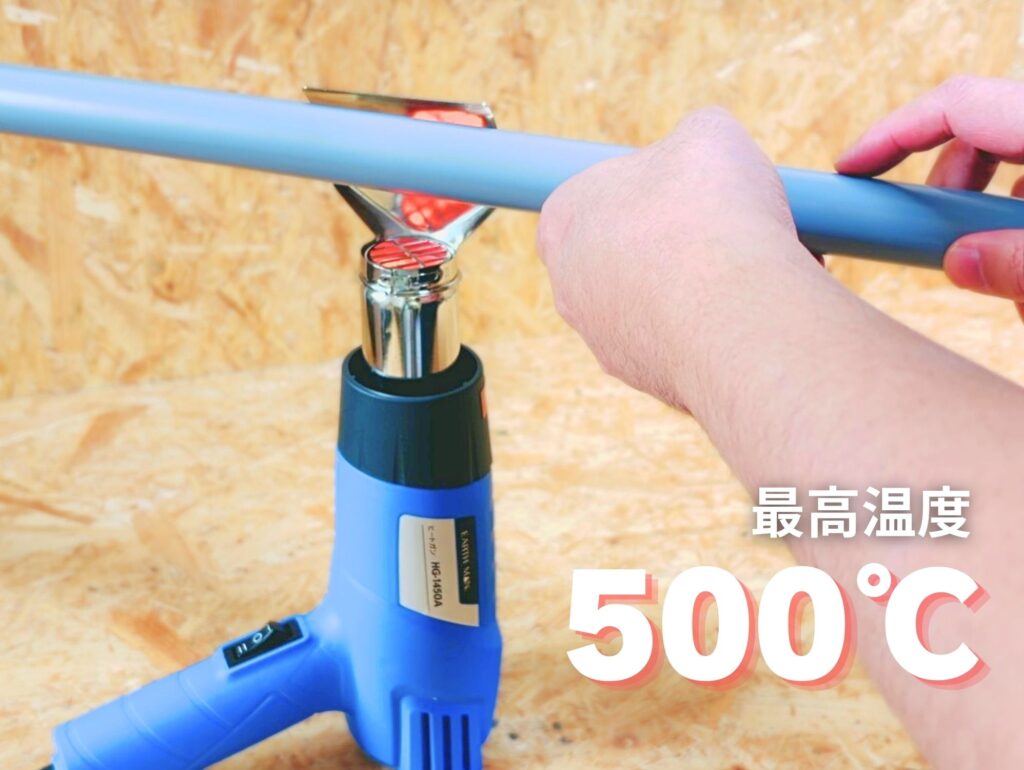 塩ビ管の曲げ加工のように上向きに温風を当てたい場面で、手を離した状態で運転を維持できます。