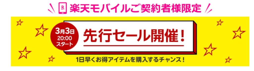 | 先行セール(楽天モバイル契約者限定) | 3月3日(火) 20:00 ~ 3月4日(水) 19:59 |