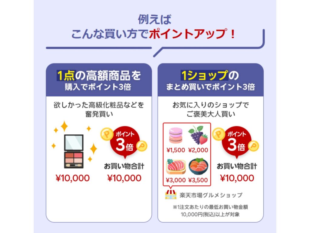 今回の楽天スーパーセールでは、買い回りとは別に「10,000円以上のお買い物でポイント3倍」キャンペーンが用意されています。