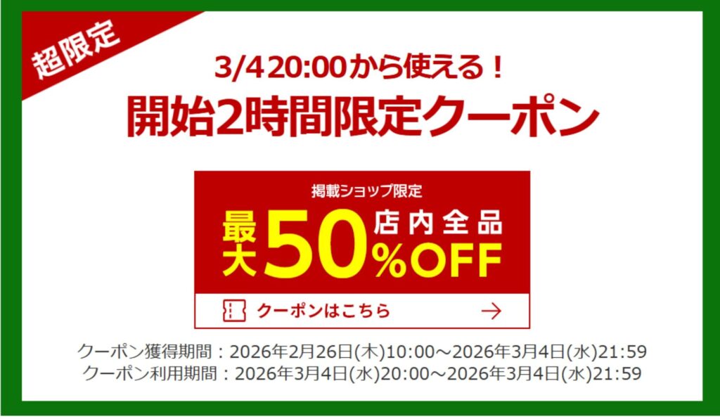 | 本セール(全員対象) | 3月4日(水) 20:00 ~ 3月11日(水) 01:59 |